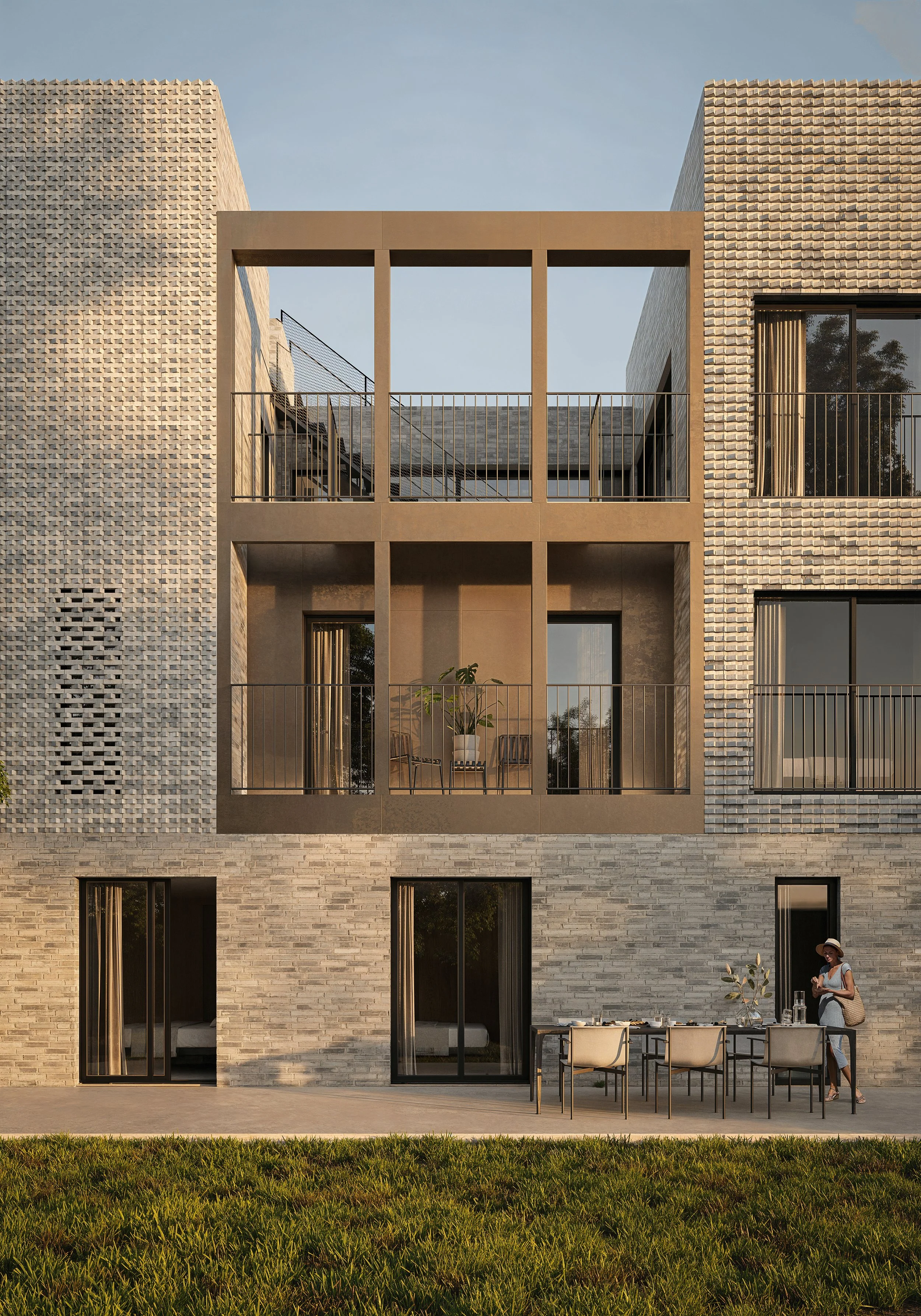 Una impresionante fachada de ladrillo manual combinada con paneles de aleación de cobre